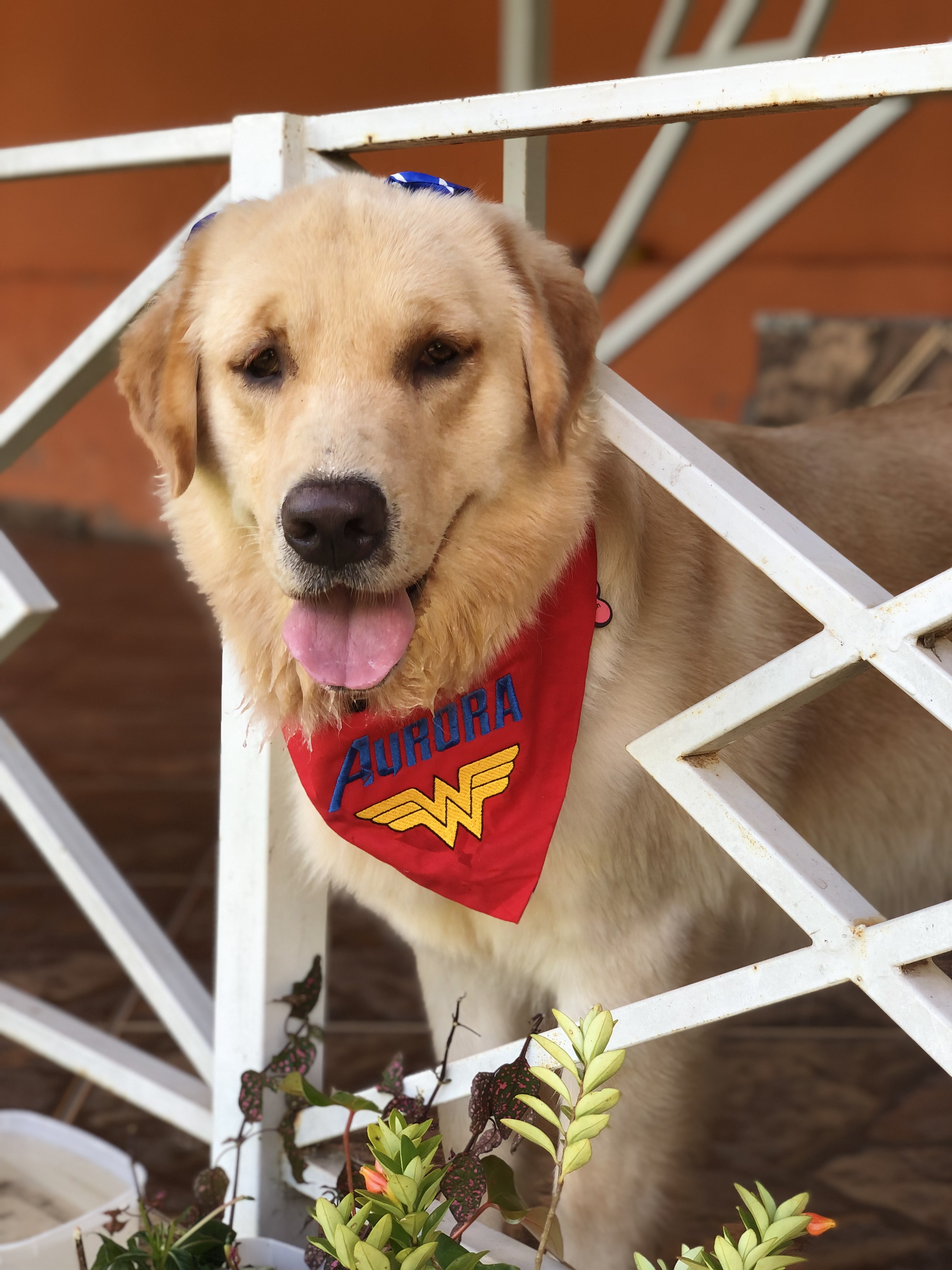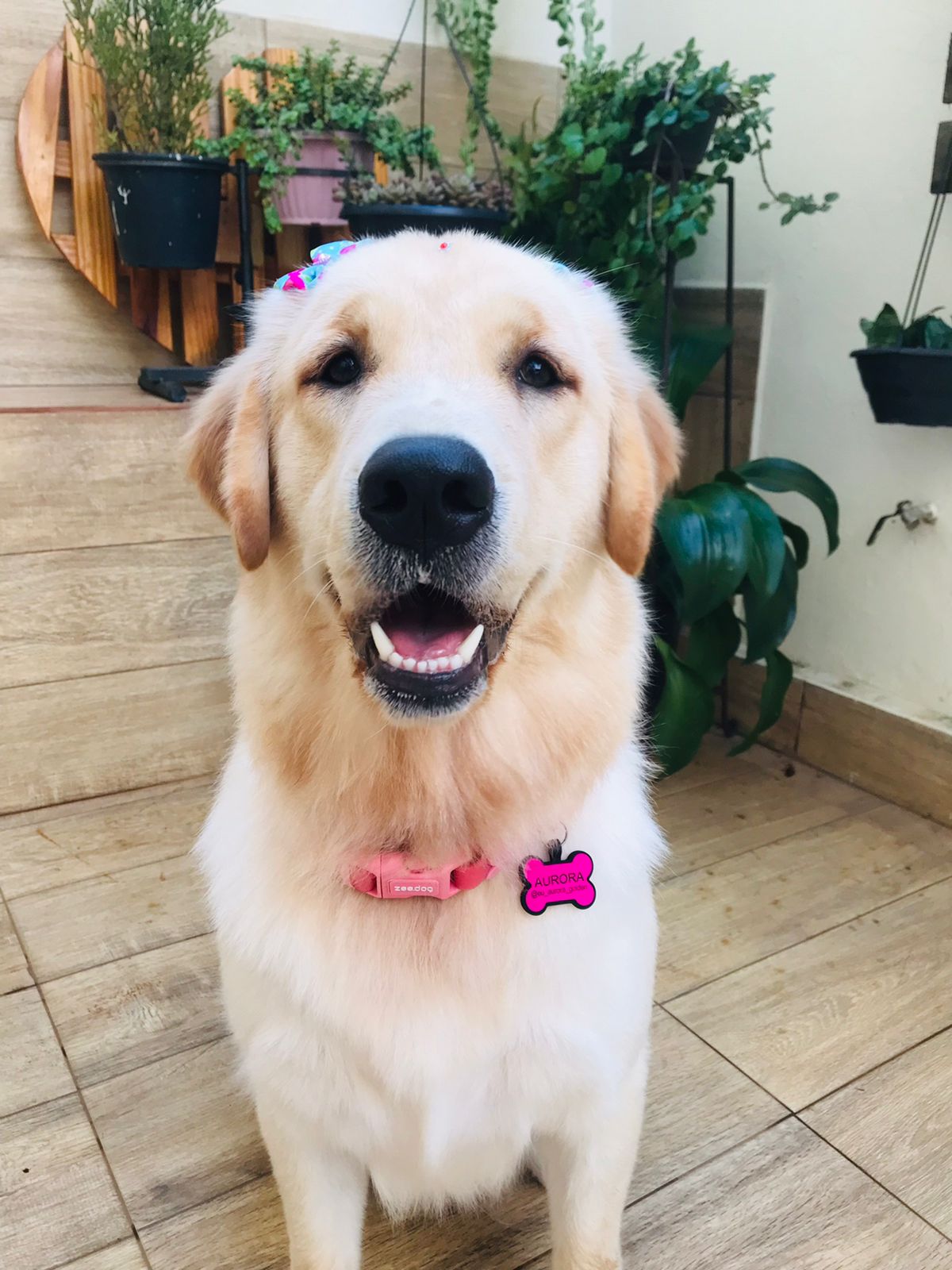 Golden retriever de pelagem cor creme, clarinha, Pouco pêlos. Olhos claros. Gordinha. Medrosa na rua. Usa plaquinha de indentificação. Instagram
