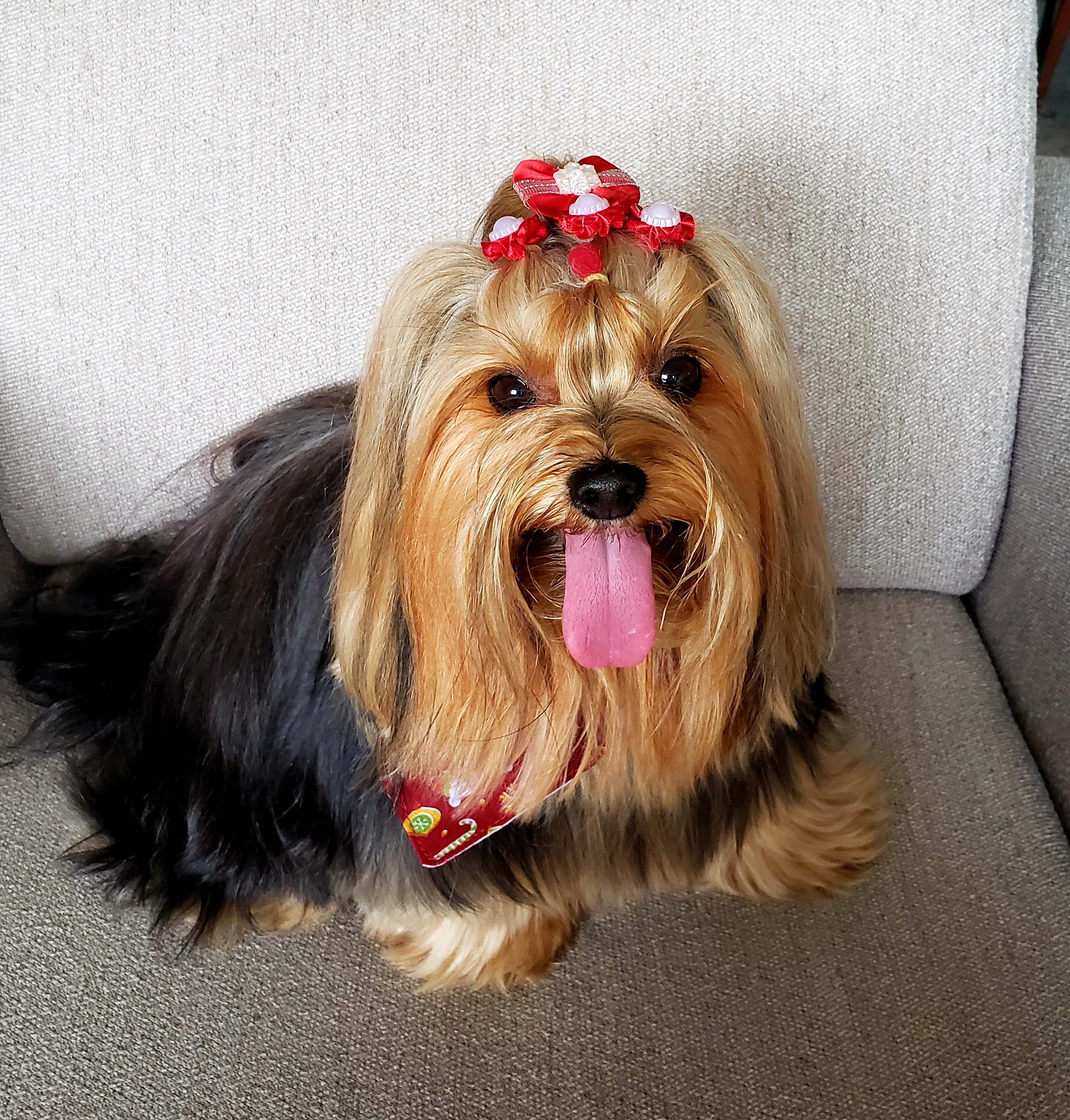 Bella é uma Yorkshire super dócil com humanos, ama crianças. É bem medrosa e apegada à família, extremamente dependente emocionante da tutora. Um pouco reativa com outros cães, principalmente com machos.