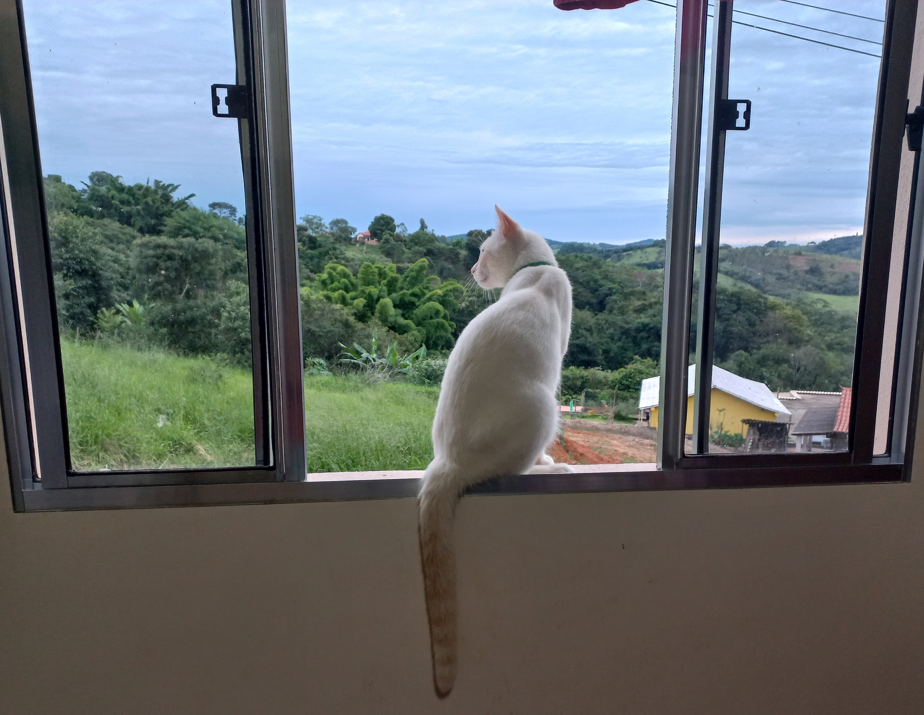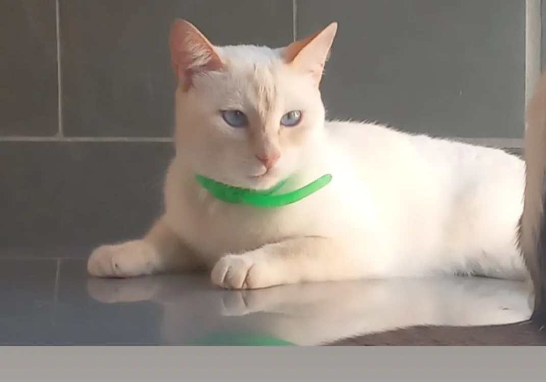 Gato macho castrado, branco um listras caramelo na cabeça e rabo, olho azul claro e um pouco vesgo, pontinhas preyas no nariz.Peso 4,5kg Dócil, come e mia muito.