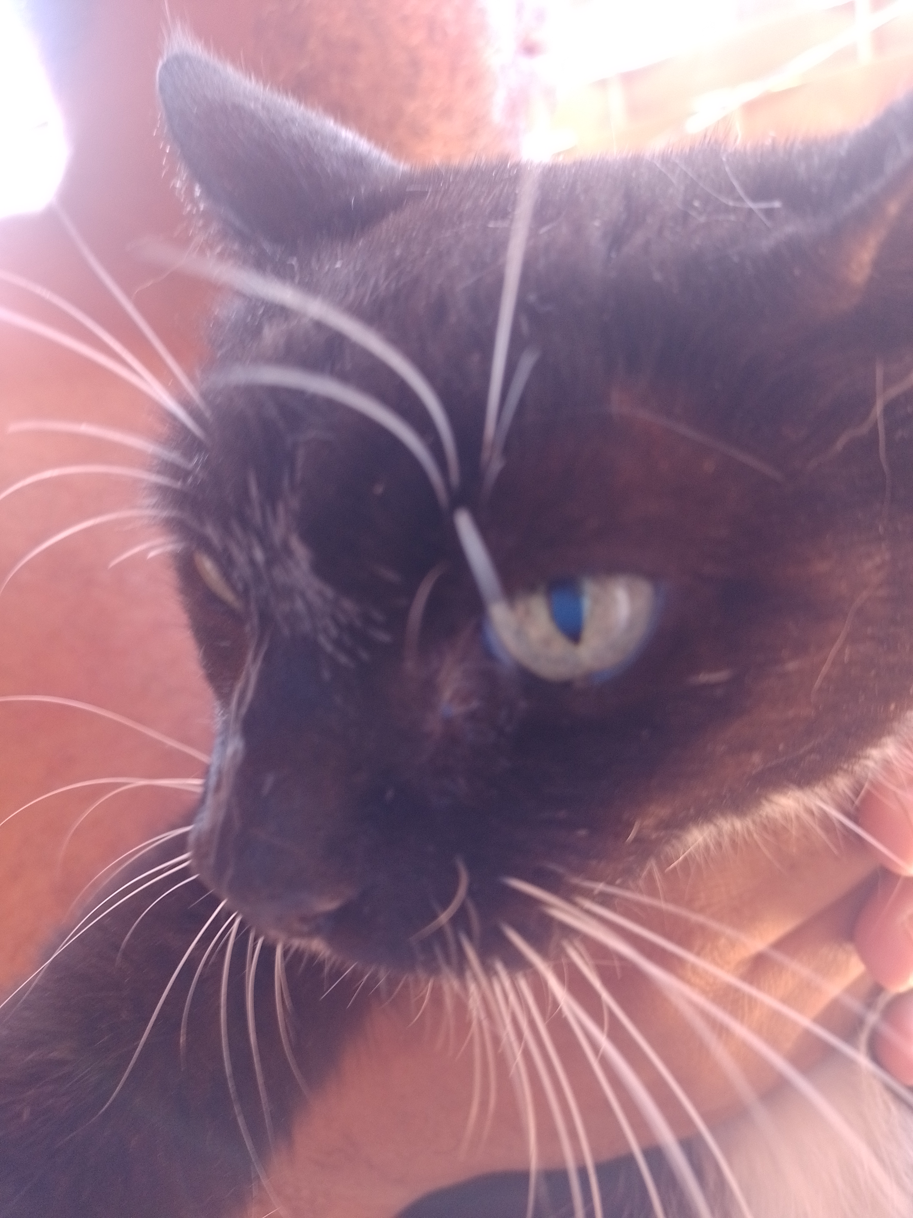 Dakota tem pelagem preta com pontas das patas e um colarinho no peito brancos ,olhos verdes claros e um jeito arisco .mas está em tratamento e apresenta uma feridinha no nariz.