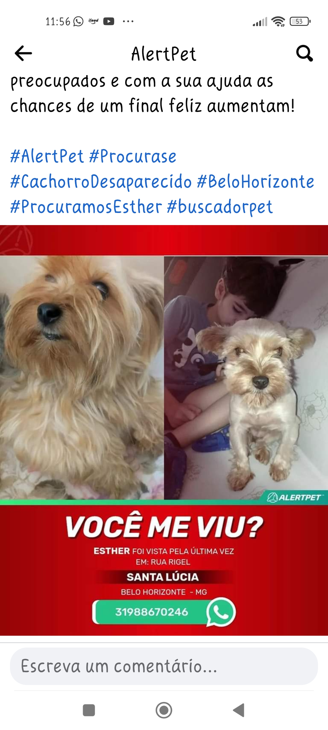 Ela se perdeu enquanto eu viajava, em 17/01/23. Nunca antes pisou na rua. Sofremos por ela todos os dias. É dourada e cinza. Rabo curtinho. Não estava tosada.