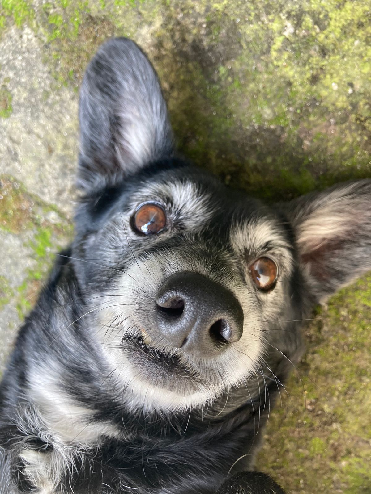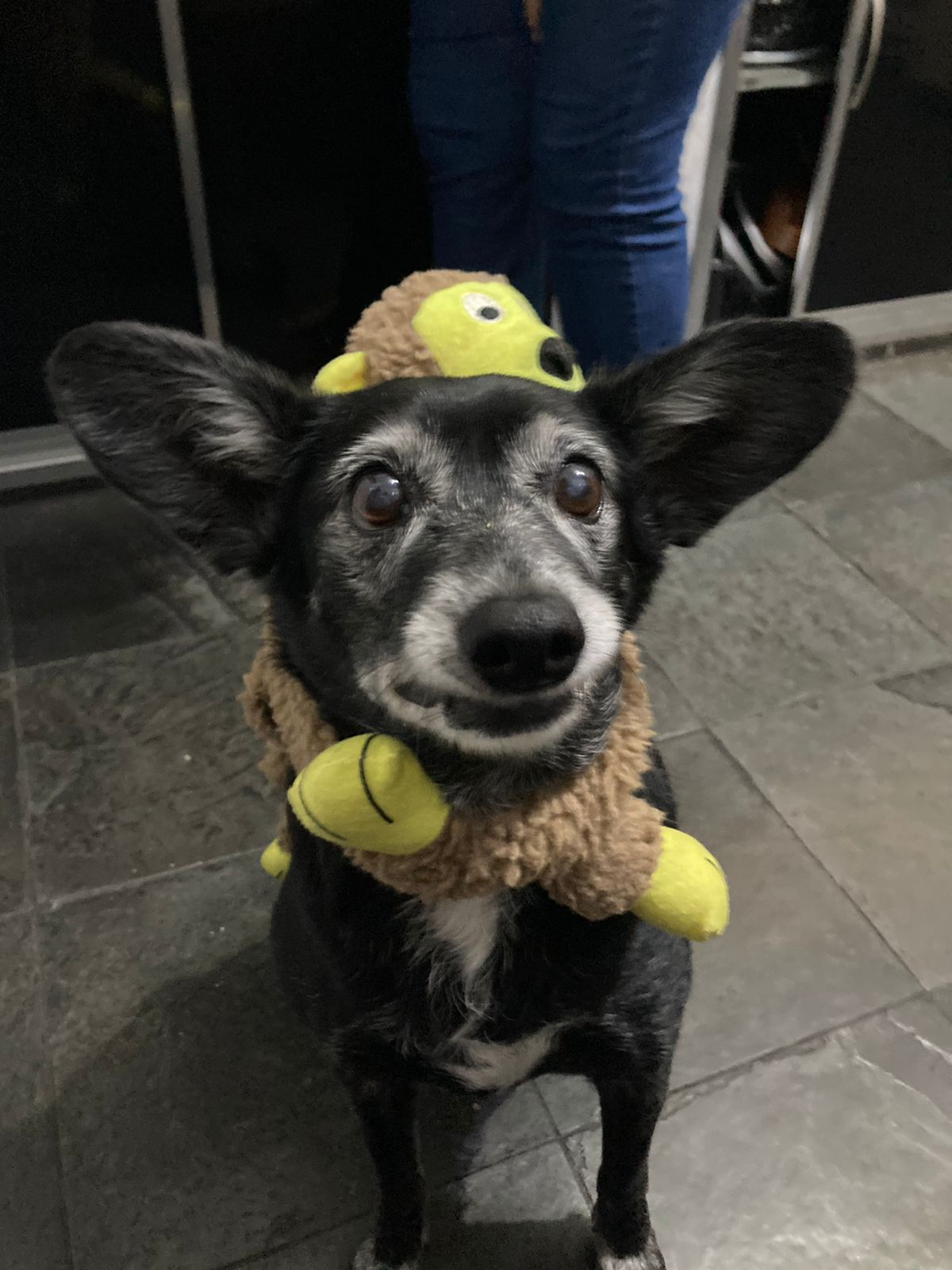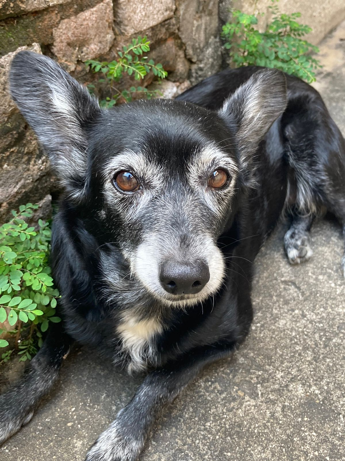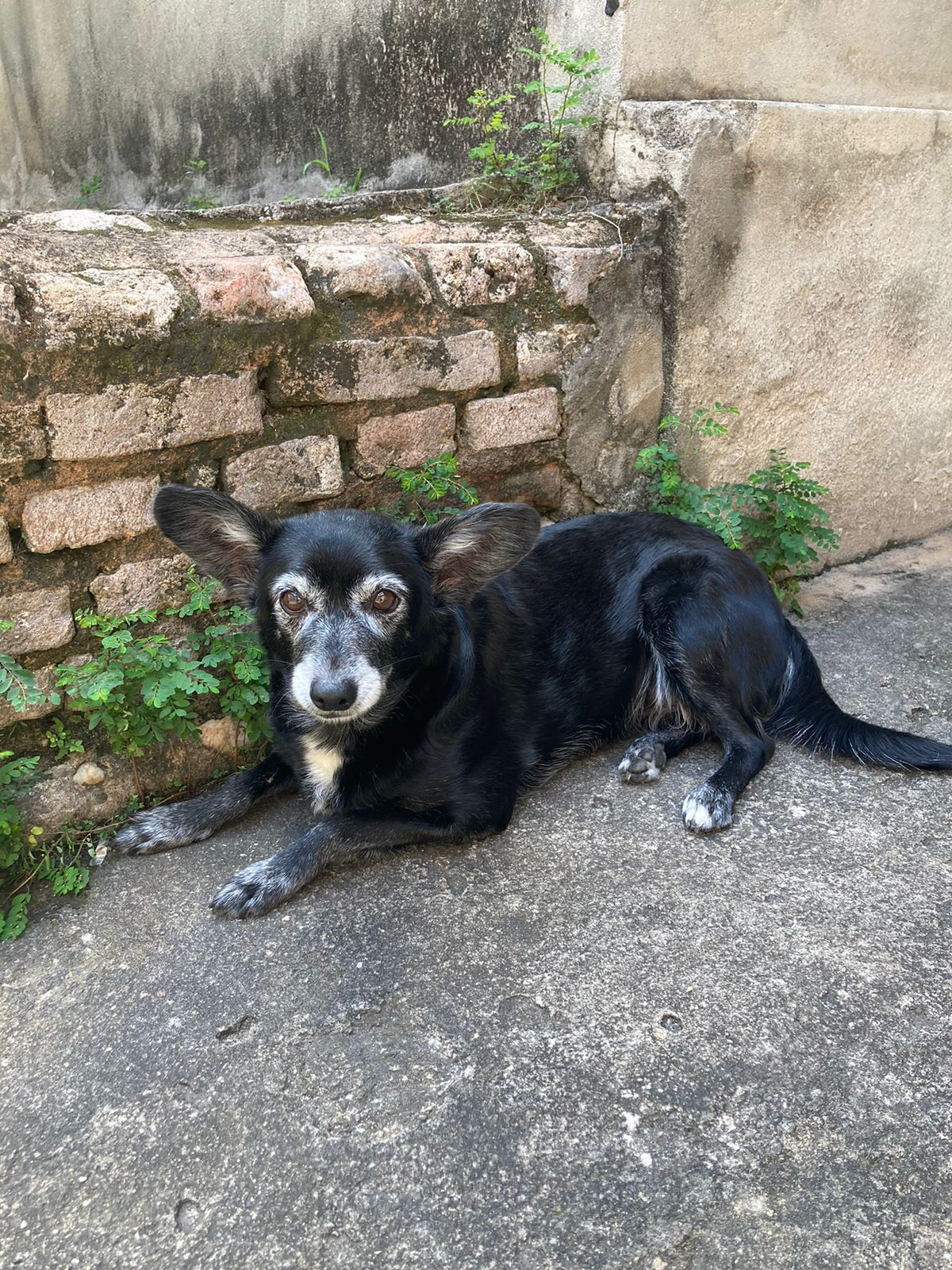 Está sem coleira. Não está acostumada com a região. Tem apenas alguns dentes, não enxerga e nem escuta muito bem, por conta da idade. Sua orelha fica 100% em pé, sendo uma característica única dela.