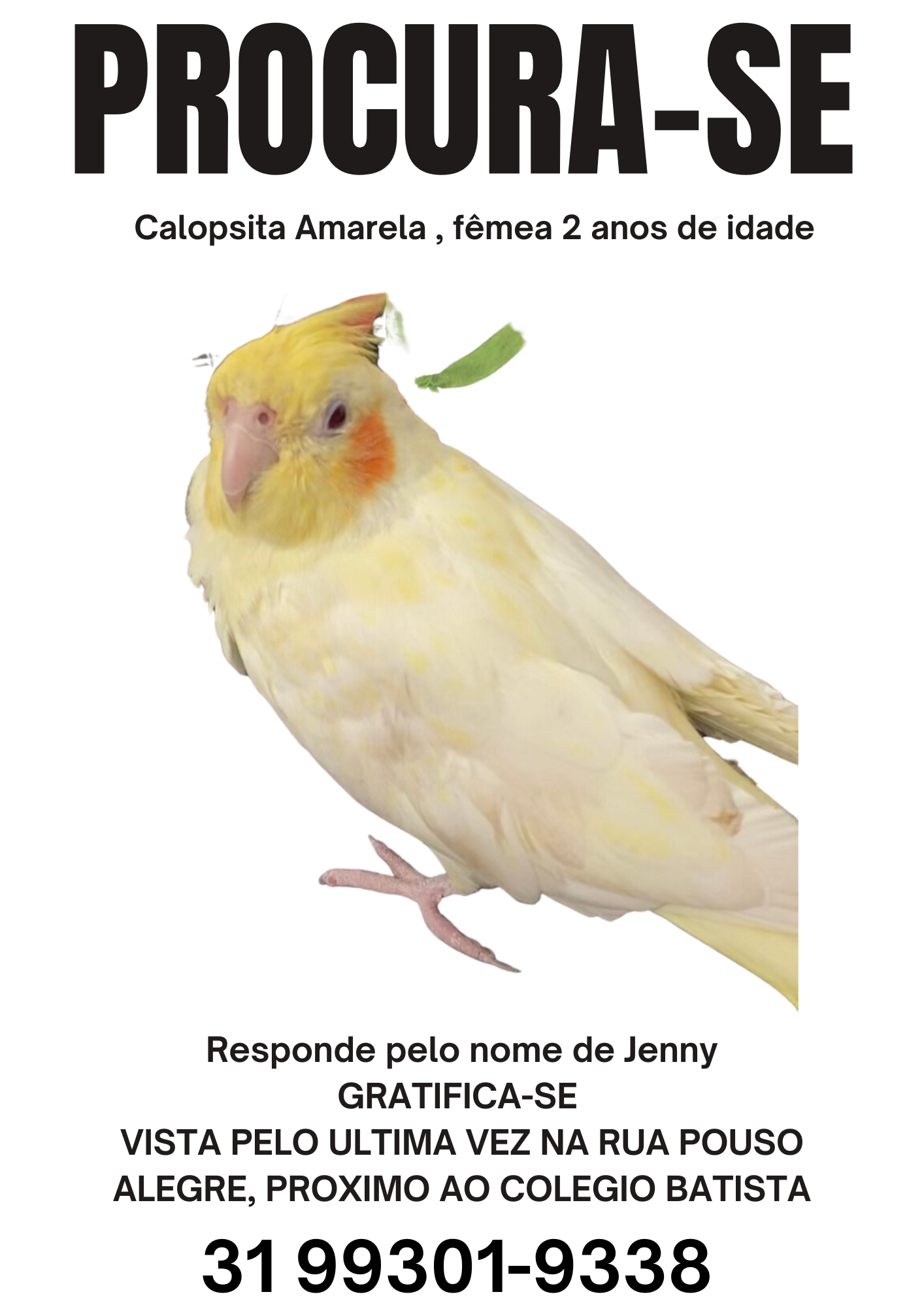 🛑⭕PROCURAMOS JENNY⭕🛑 💰 GRATIFICA-SE 💰 No dia 16/05/2023, por volta das 10hrs, uma calopsita fêmea desapareceu e precisa ser encontrada. A calopsita atende pelo nome de Jenny e é muito mansa. Ela foi vista pela última vez próxima ao colégio Batista, mas foi avistada voando em direção à Avenida Silviano Brandão. A calopsita tem um parceiro que está constantemente piando em busca dela. Se você tiver alguma informação sobre o paradeiro de Jenny, por favor, entre em contato conosco. Será oferecida uma gratificação para aqueles que ajudarem a encontrar a calopsita. ❗ Vista pela última vez em: Rua Pouso Alegre 📍 Bairro: Floresta 📍 Ponto de referência: Caindo Fulo (loja) 📍 Belo Horizonte – Minas Gerais 📆 Em: 16/05/2023 📞 Tel: 31 993019338 🧒🏽 Pessoa responsável: Vanessa 🟡 Se você não o viu mas é da cidade do desaparecimento nos ajude compartilhando, seus tutores estão preocupados e com a sua ajuda as chances de um final feliz aumentam! #AlertPet #Procurase #PassaroDesaparecido #BeloHorizonte #ProcuramosJenny