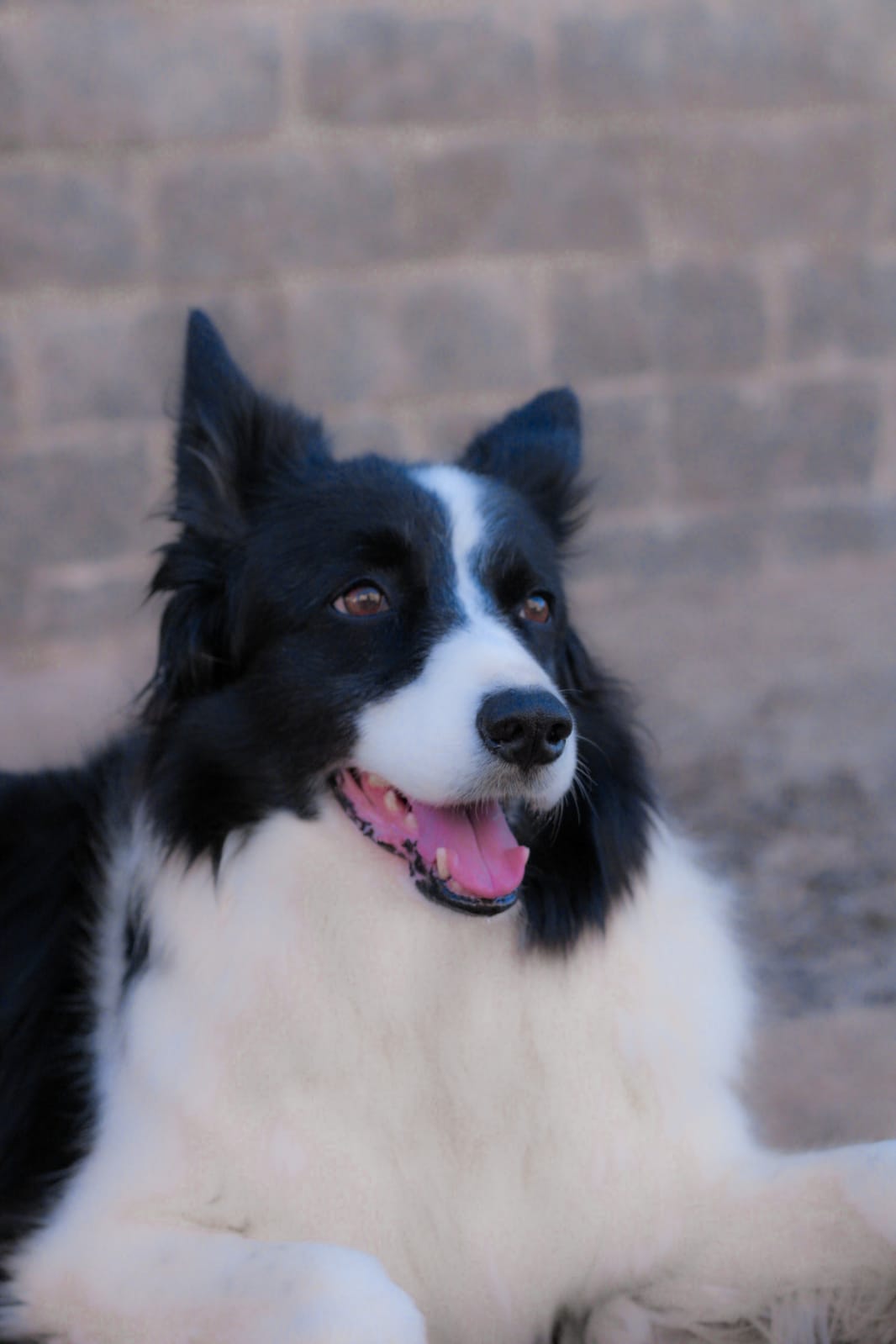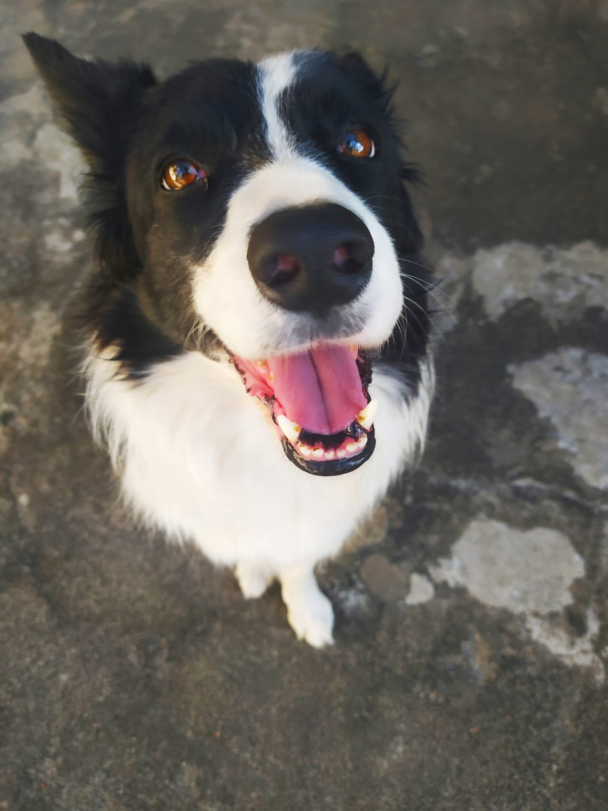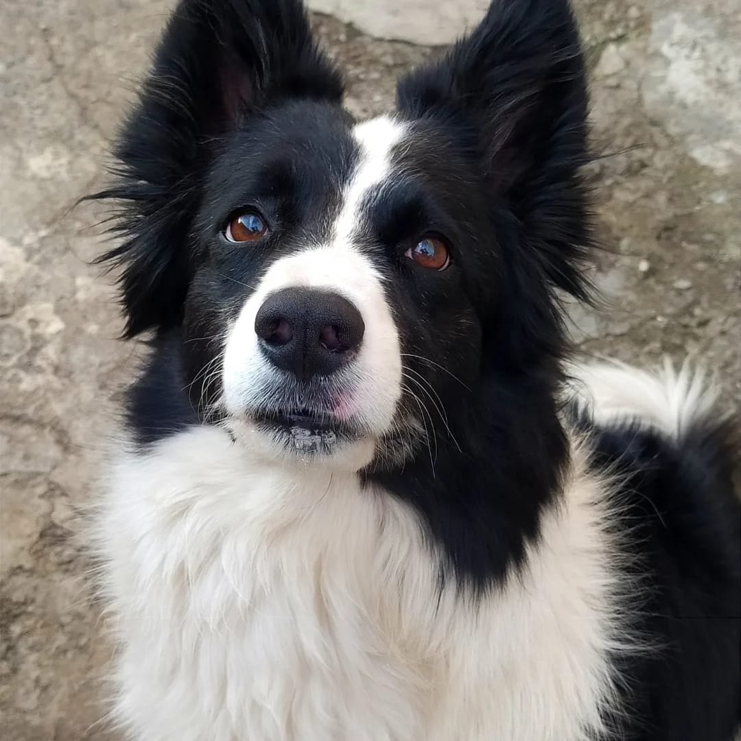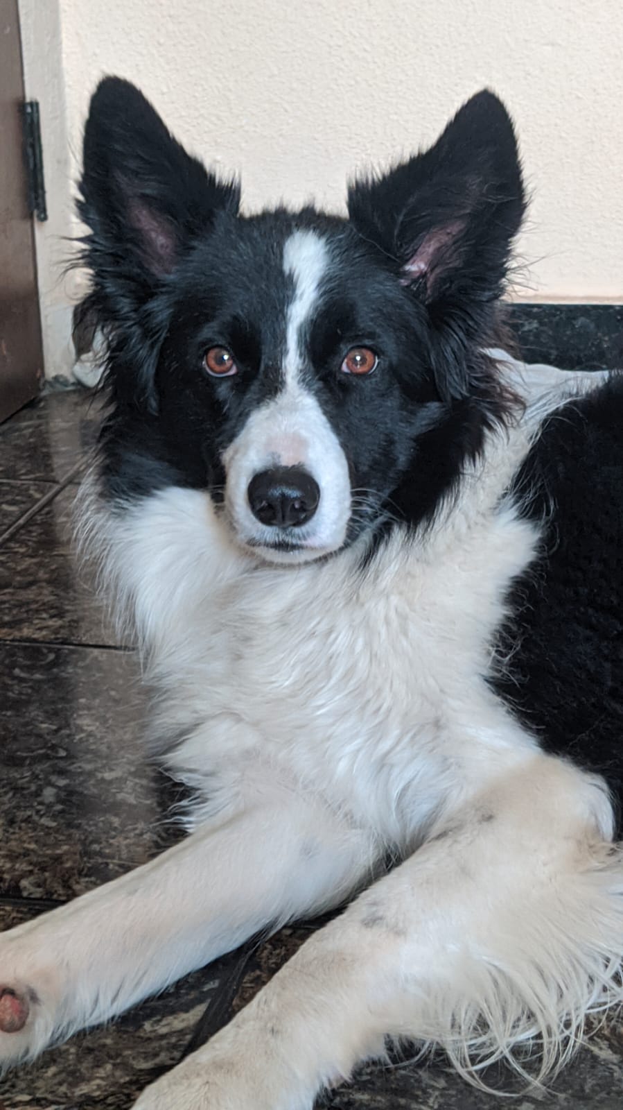 Luna é uma Border Collie preta e branca super sociável e dócil, gosta de pessoas e confia nelas. Luna faz tratamento para ansiedade e comportamento de deslocamento.