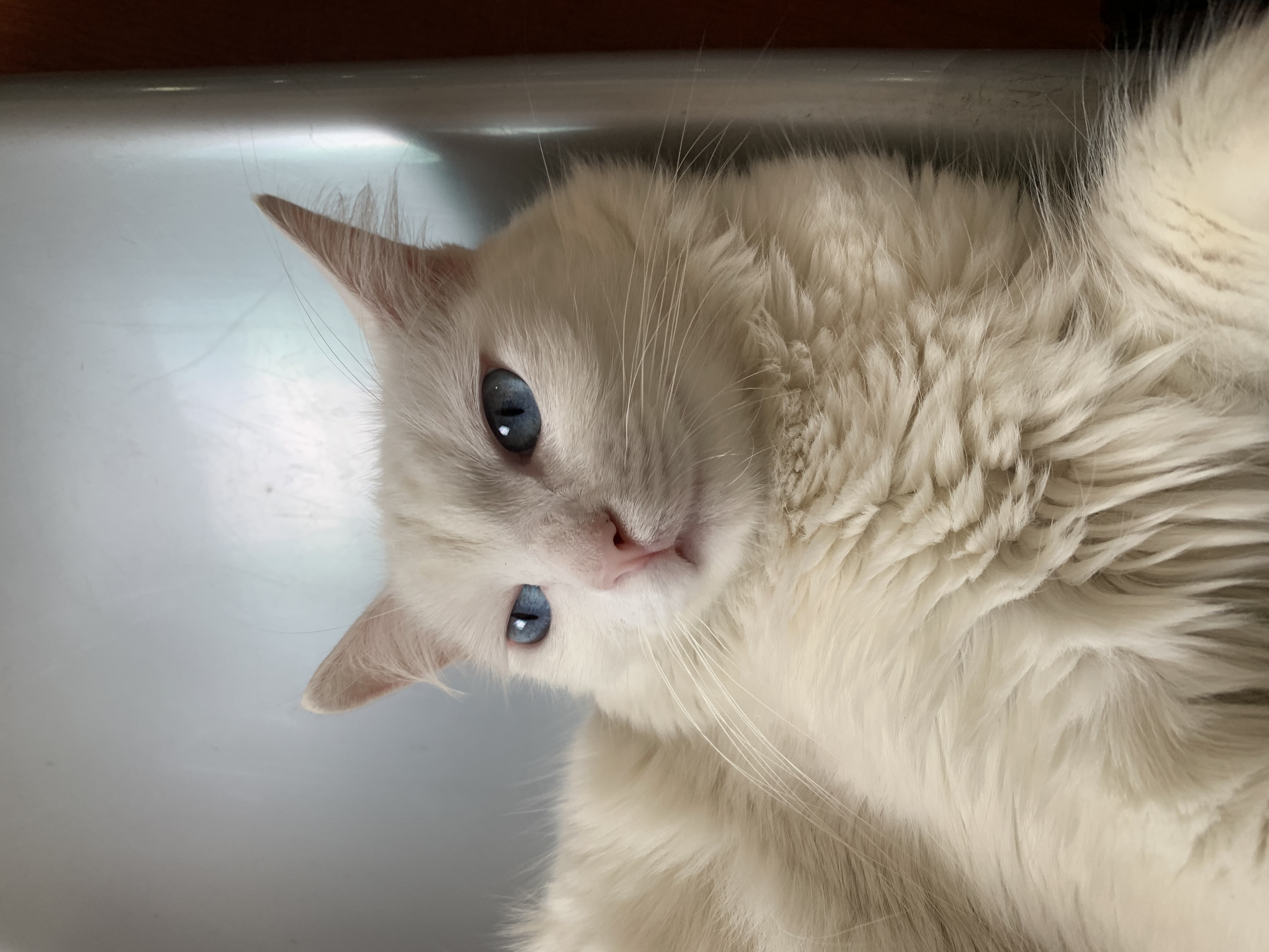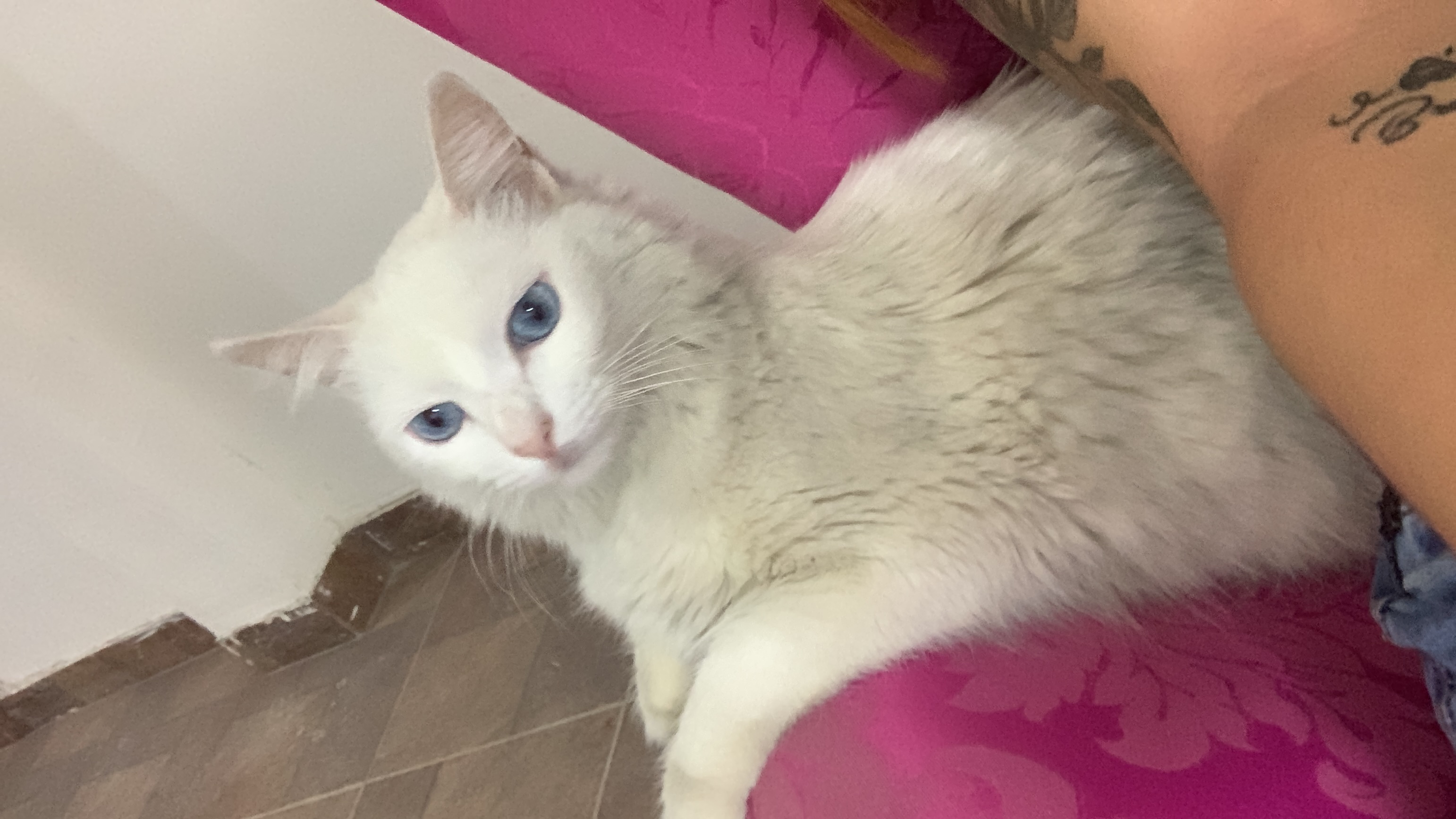 Ela é toda branca do olho azul, super tranquila e é surda. Não ouve um barulho sequer.