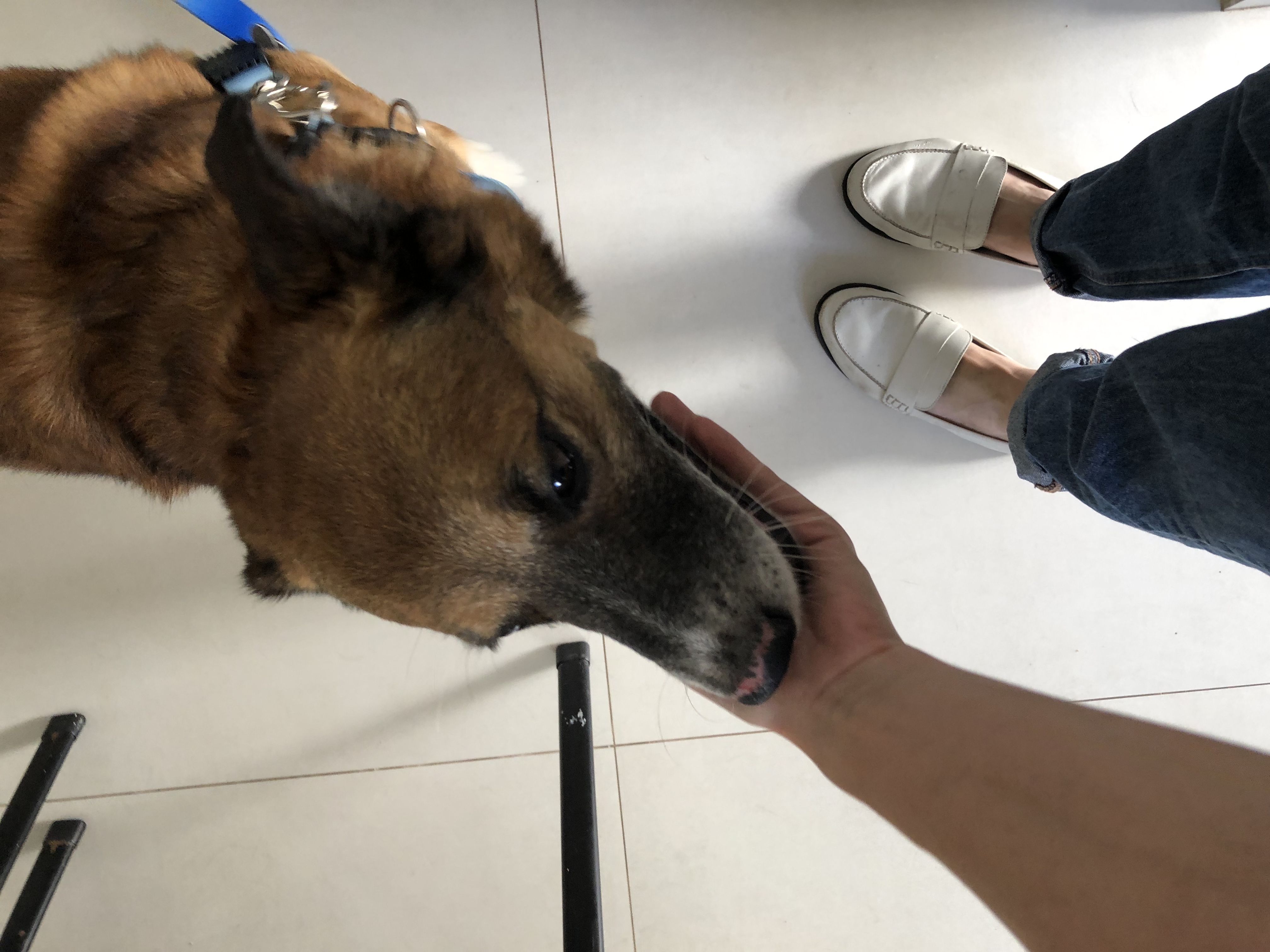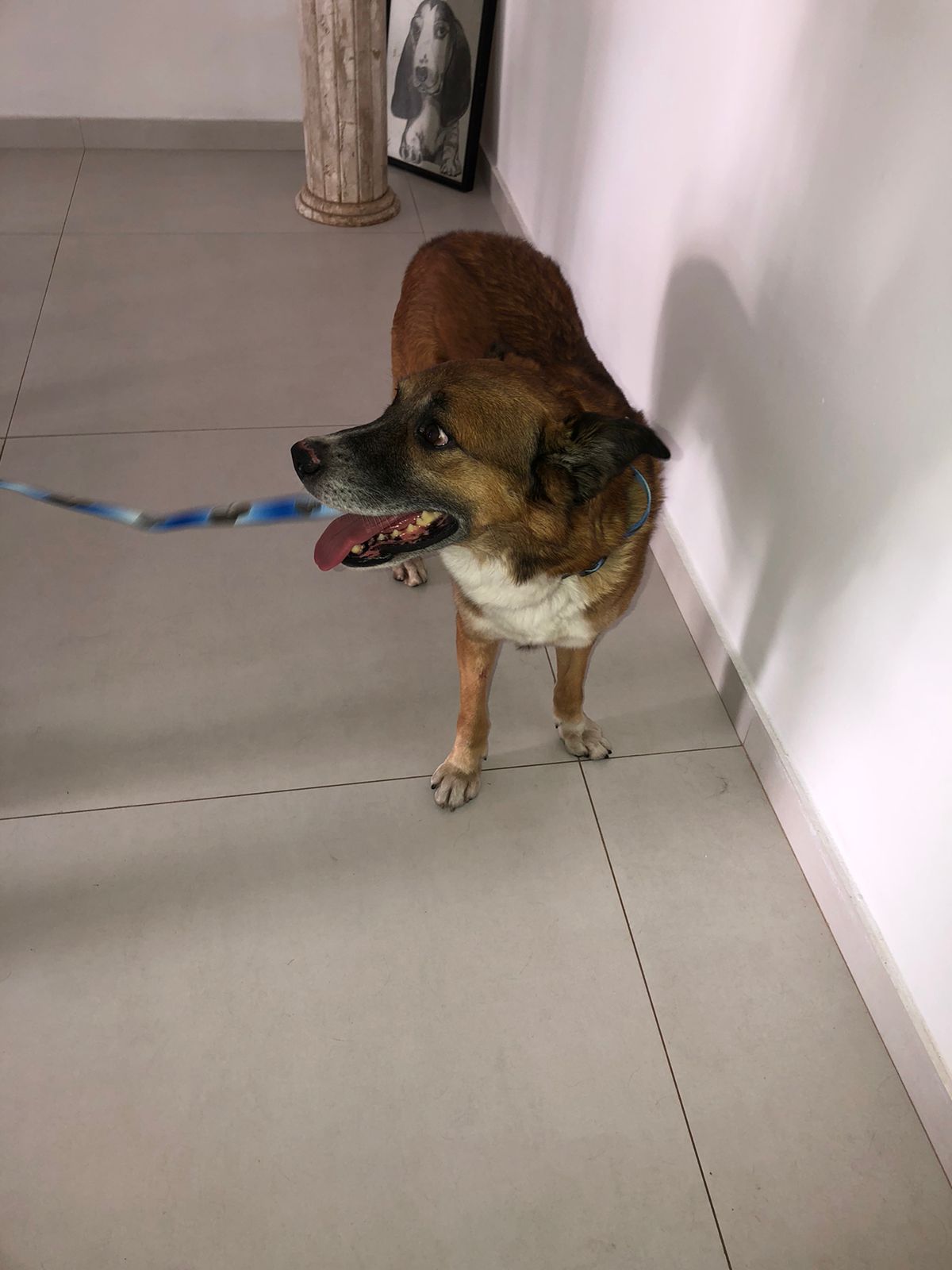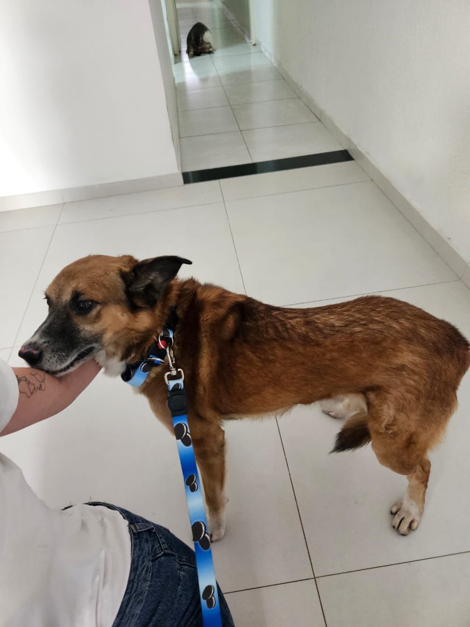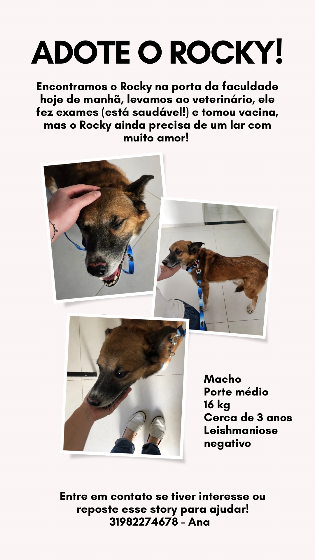 O rocky se aproximou pedindo carinho, subindo no colo, todo carinhoso! Comprei uma coleira, ele deixou colocar e fomos andando até o veterinário. Fez exame de leishmaniose e cinomose, ambos negativos, e tomou a vacina v8. Está saudável e tem entre 2 e 3 anos!