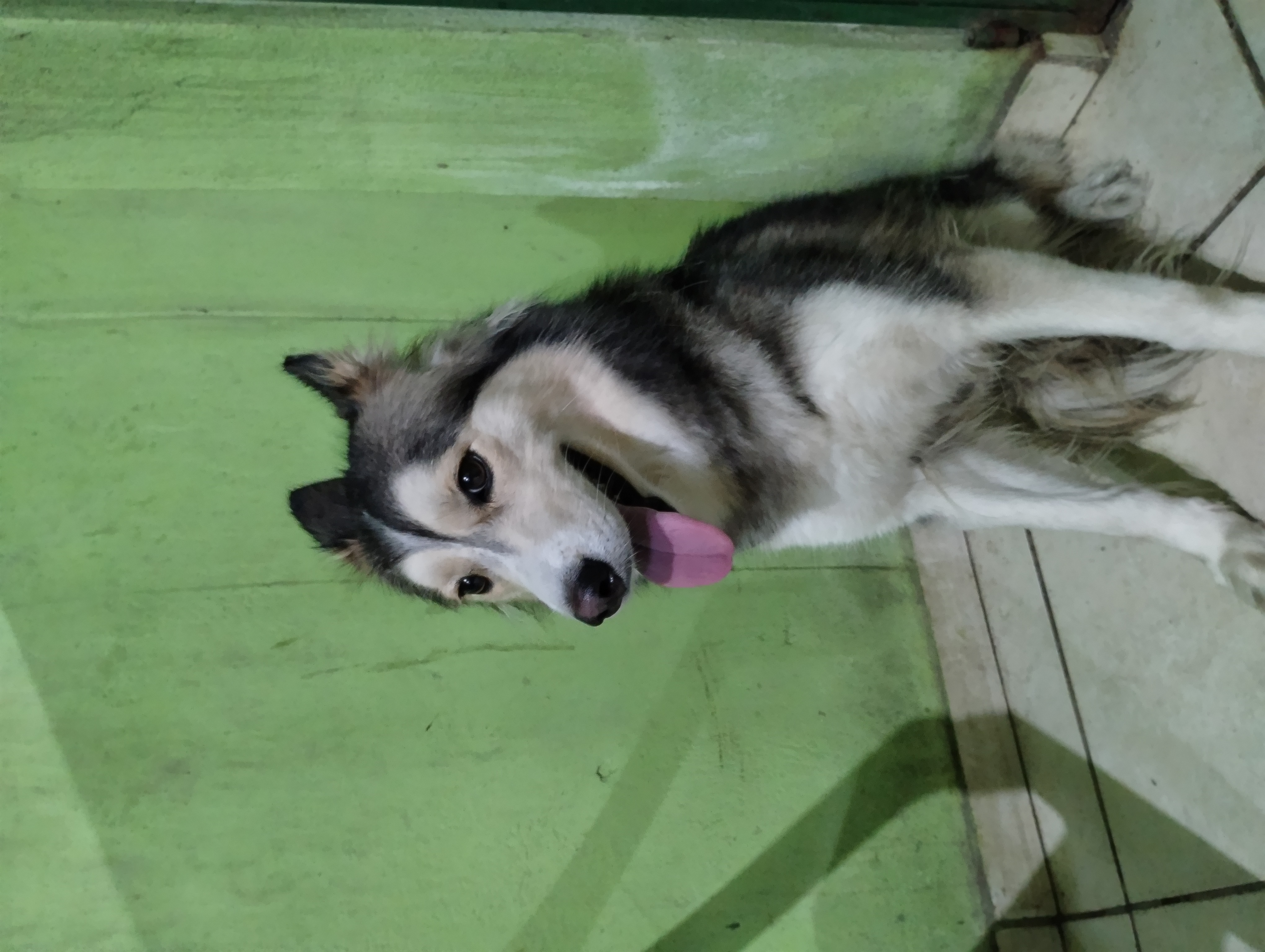 A cadela estava correndo na avenida e quase foi atropelada várias vezes. Estava no posto de gasolina e resolvemos resgata-la para evitar o pior. Ela estava muito assustada.