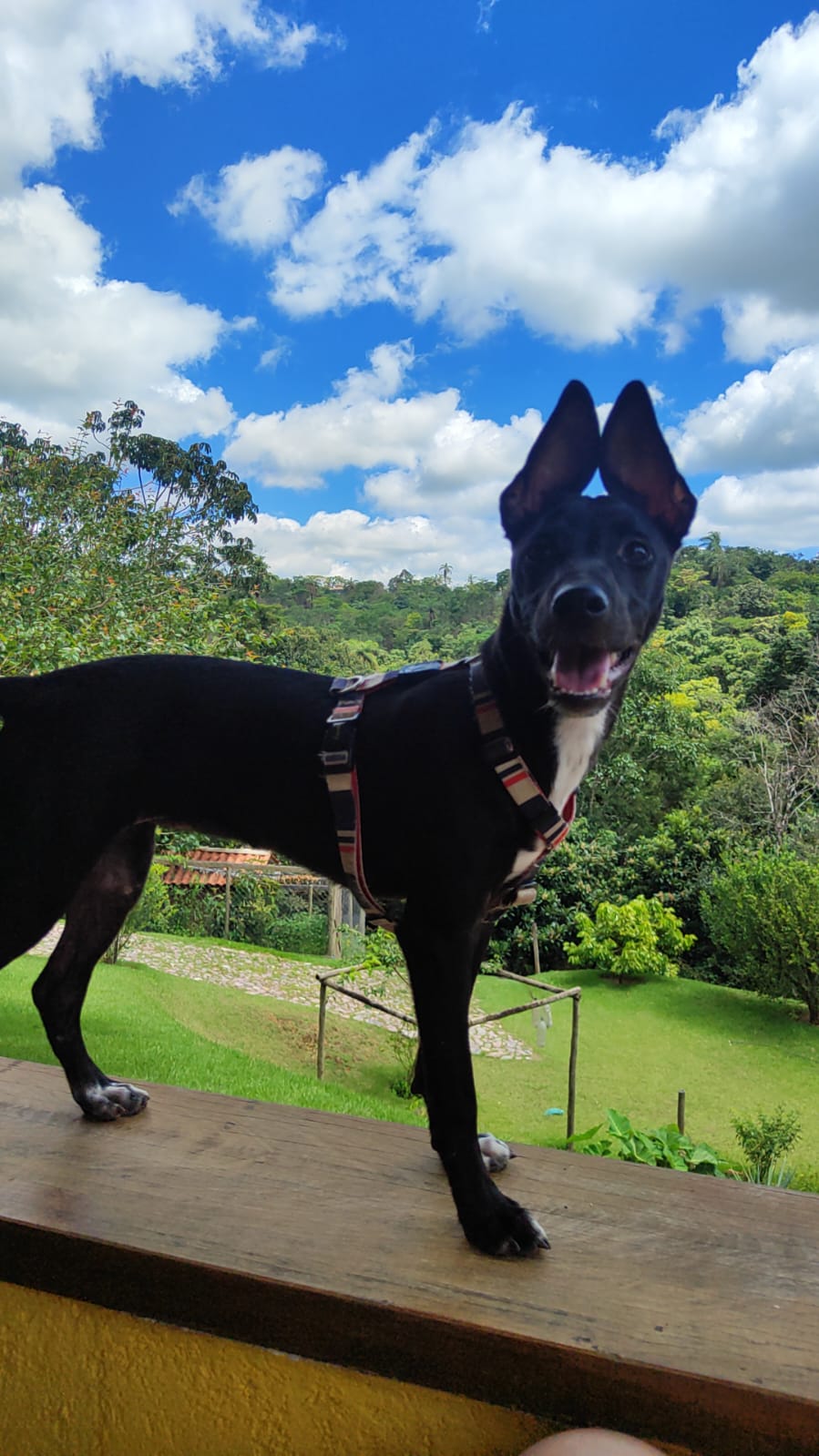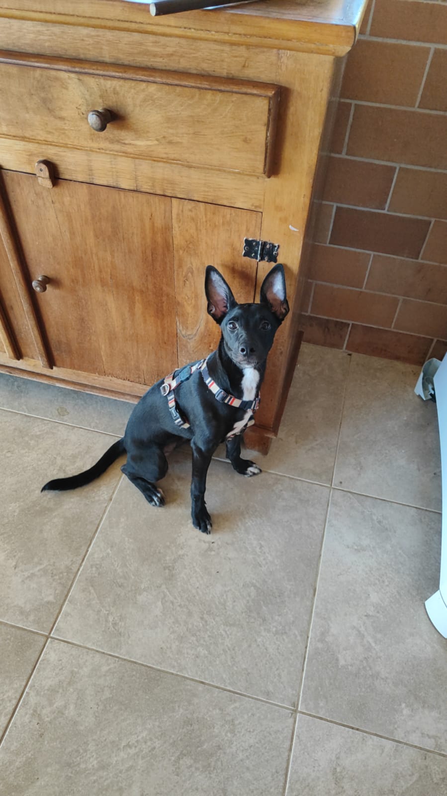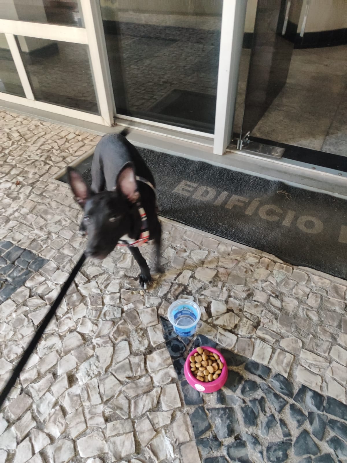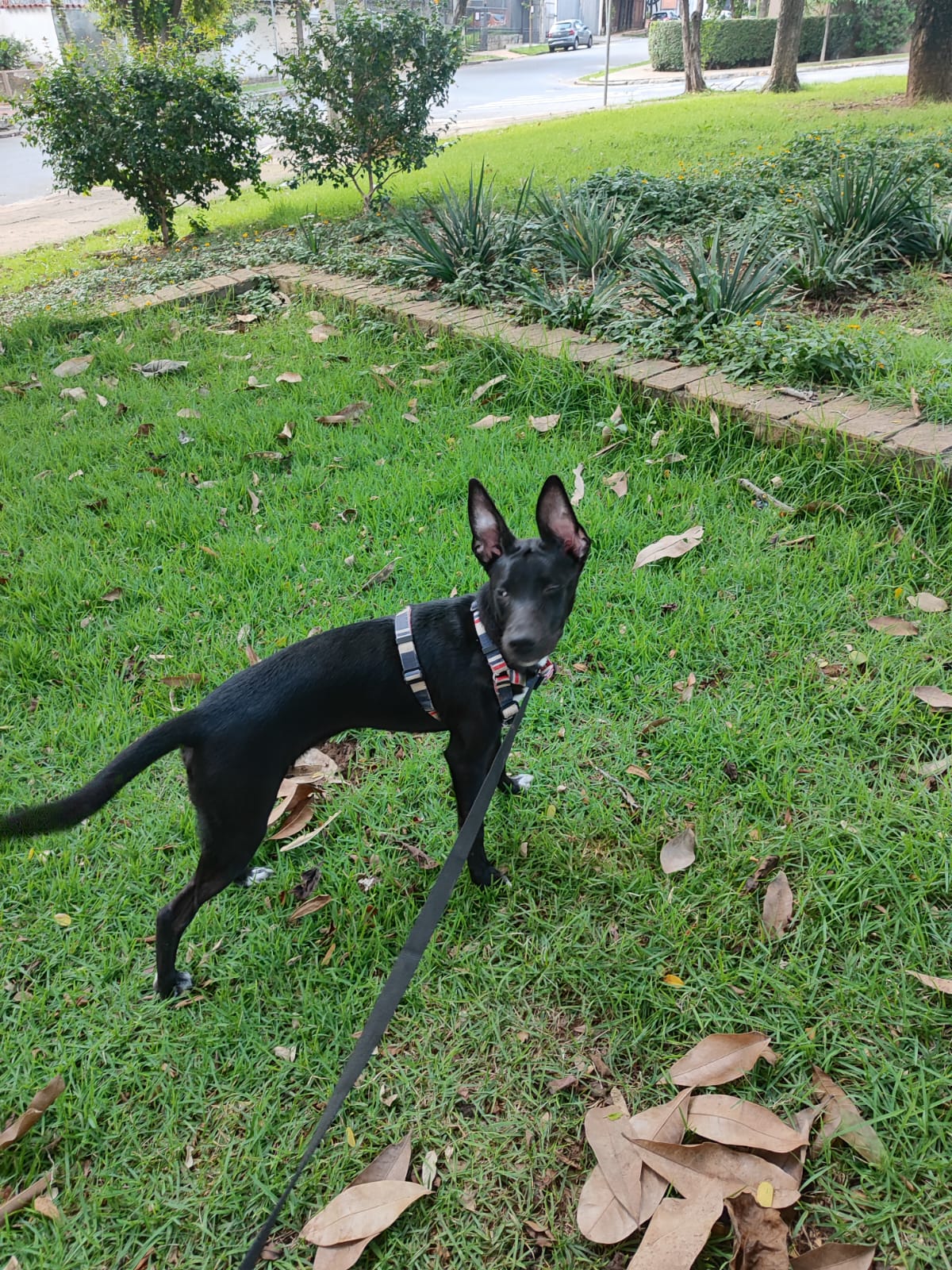 Ela estava andando na beirada do passeio, cheirando o chão. Eu sai do meu predio para passear com o meu cachorro e ela veio em nossa direção. Chamei ela para dentro do predio e veio tranquilamente, com o rabinho entre as pernas. Pegue comida e agua e ela quis somente a agua. Coloquei uma coleira e aceitou. Levei no Veterinario para dr banho e avaliar o estado dela. Está de unhas cortadas e aceita comando de sentar para pegar petisco. Não recusa a coleira. A Veterinária deu vermifugo e tirou sangue para fazer exames. Pela dentição parece que tem entre 6 a 8 meses. É super docil e medrosa. Com o tempo, vem logo para o colo. Por isso penso que deve ter tido um lar.