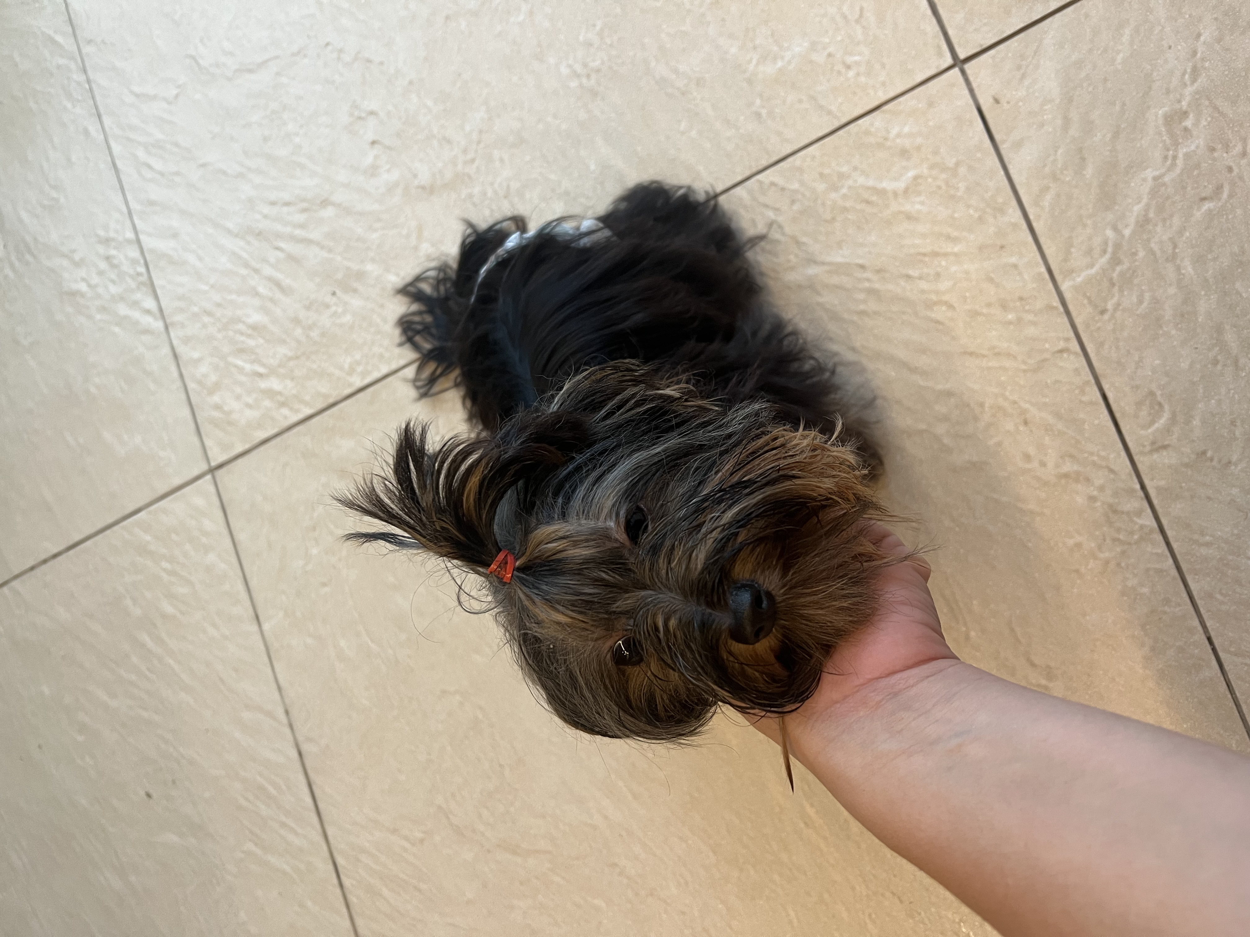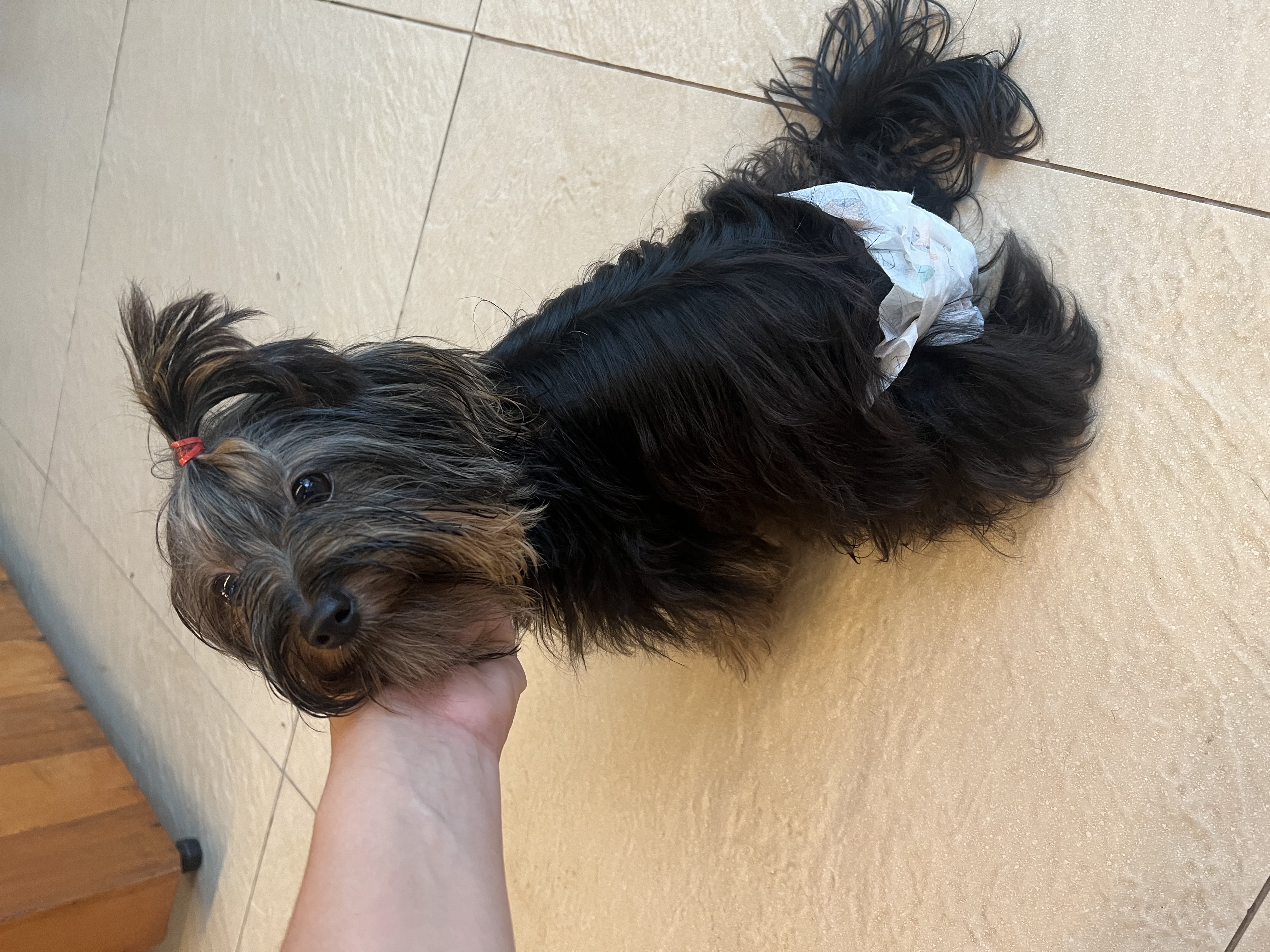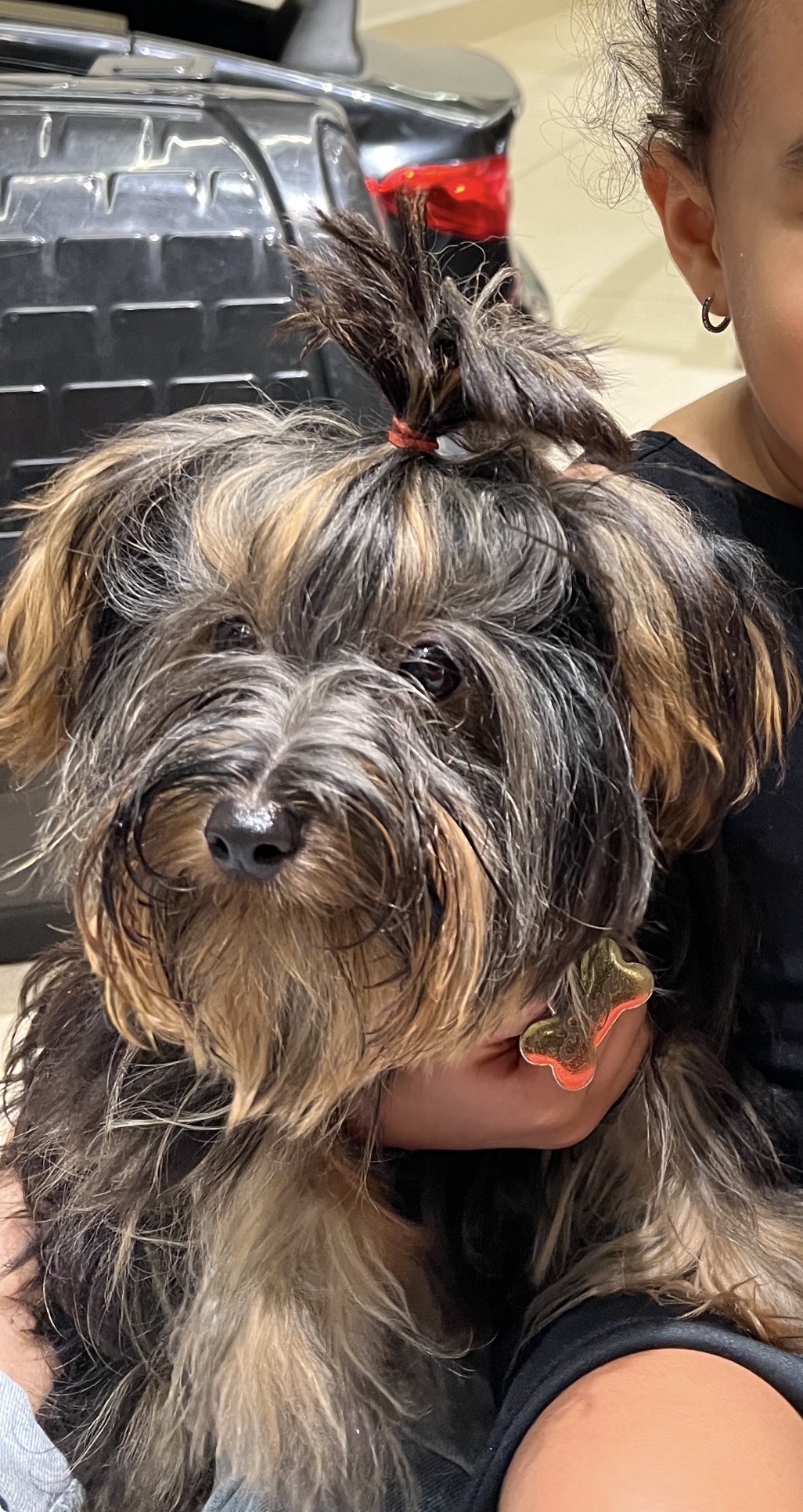 Skye estava de coleira de ossinho com o nome e telefone dos tutores, ela é preta com caramelo, muito dócil.