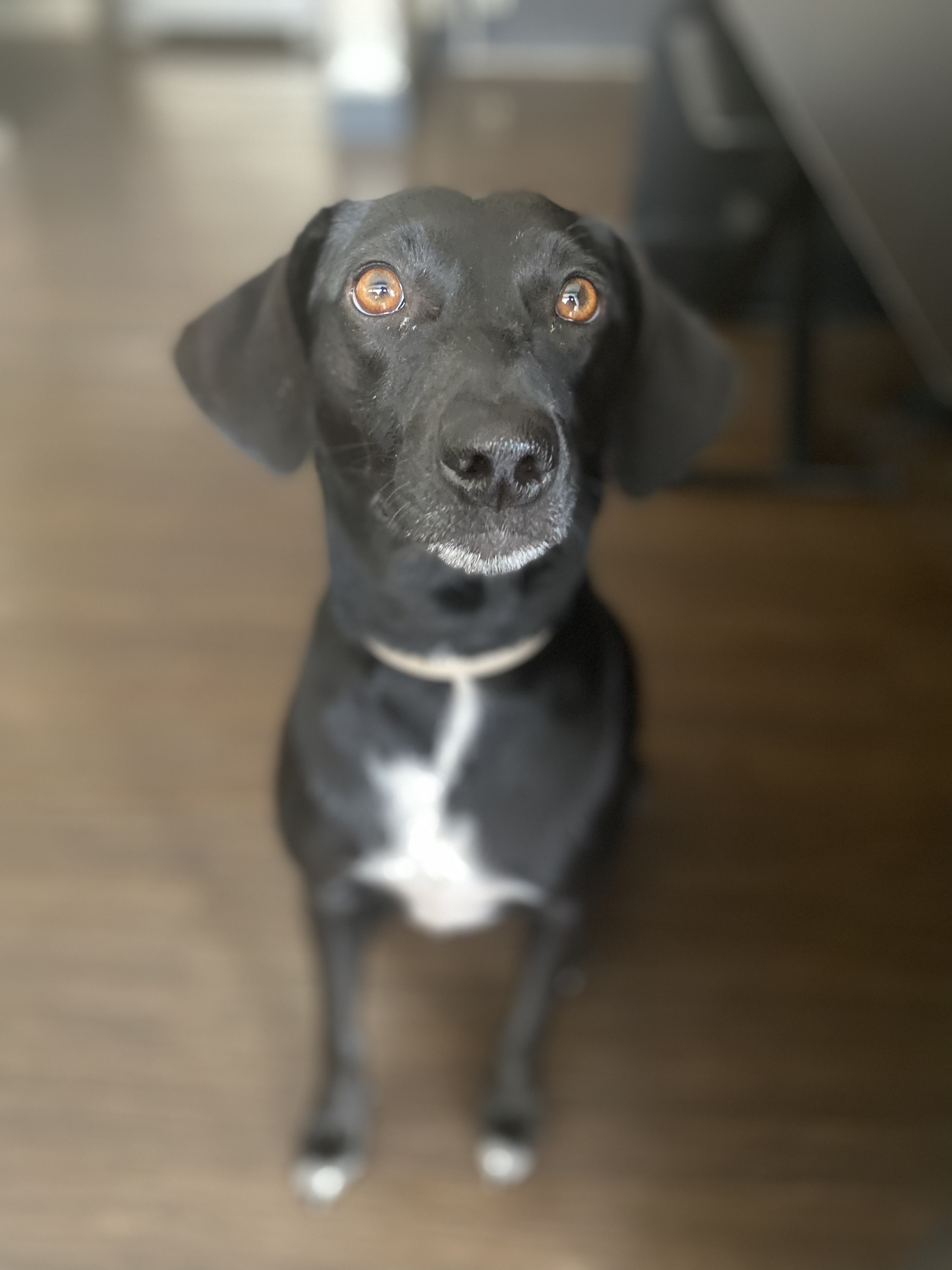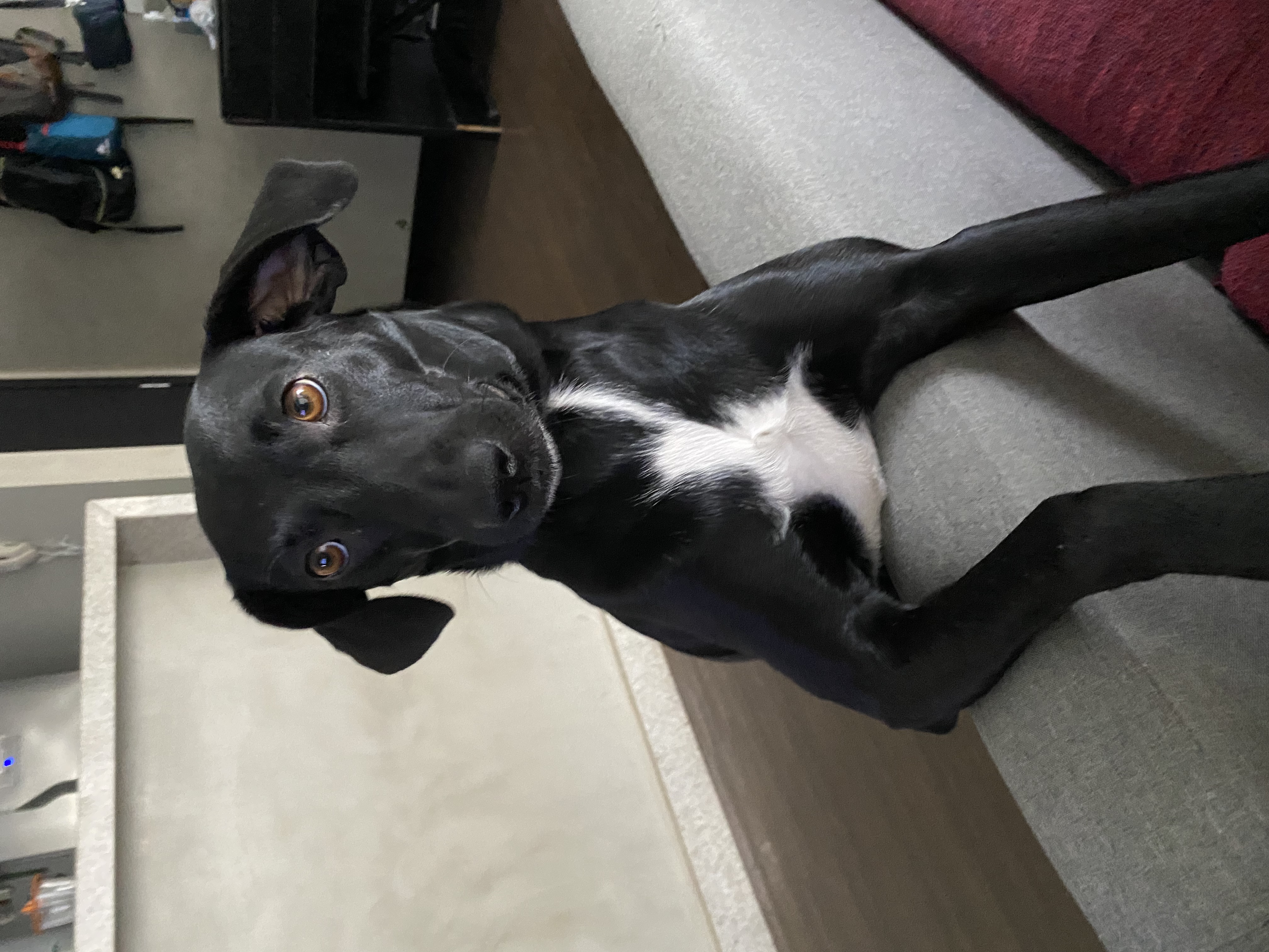 Vira lata preta com mancha branca no peito, tamanho médio, dócil